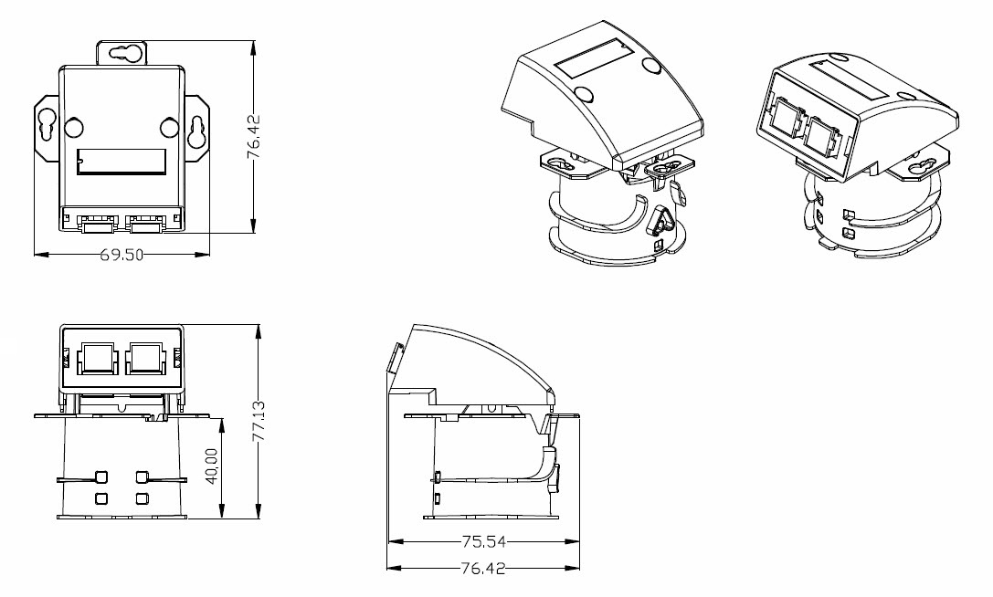 Data outlet depth of 40mm for installation in flush-mounted boxes or cavity wall boxes