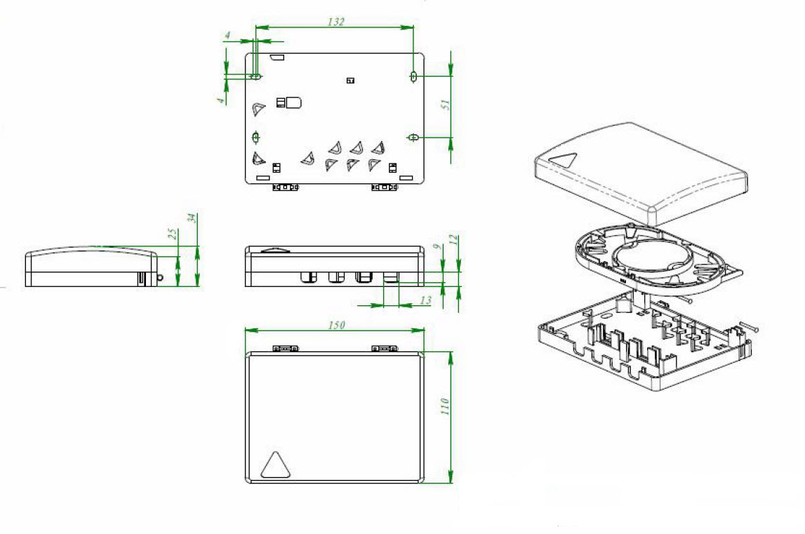 Produktinformationen für FTTH Indoor Anschlussbox für 4Fasern, 4Kupplungen, Faserüberlängenaufnahme