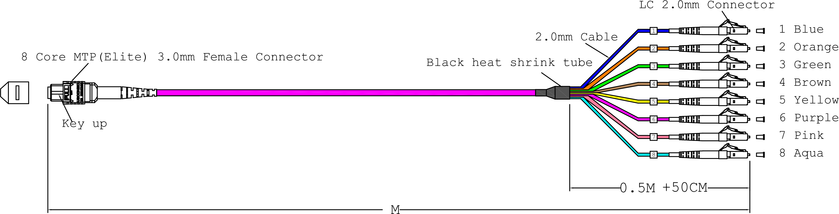 | MTPF08LCOM4-1 | MTP®(F)-LC Trunkkabel OM4 8 Fasern Typ B LSZH erika-violett 1m | 8 | 1 x MTP® female | 8 x LC | 1,0 m | |