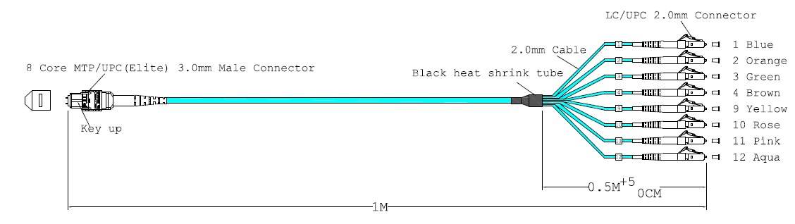 | MTPM08LCOM3-1 | MTP®(M)-LC Fanoutkabel OM3 8 Fasern Typ B LSZH aqua 1m | 1 x MTP® male | 1,0 m | 8 | 8 x LC |