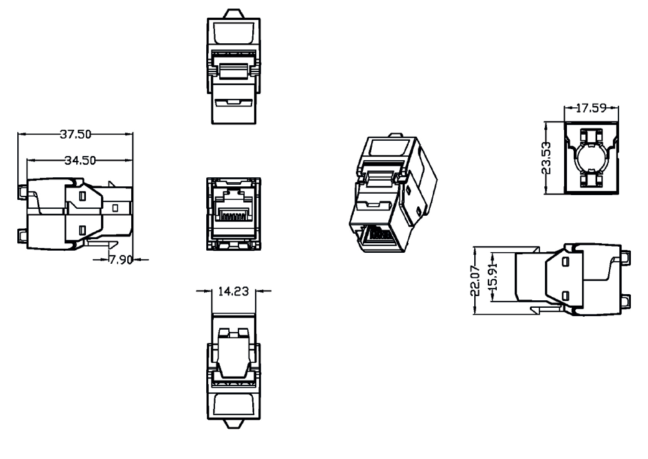 1 x RJ45 Keystone, Kabelaufteiler, 1 x Kabelbinder, 1 x Staubschutzkappe (aufklappbar), 1 x Montageanleitung (englisch)